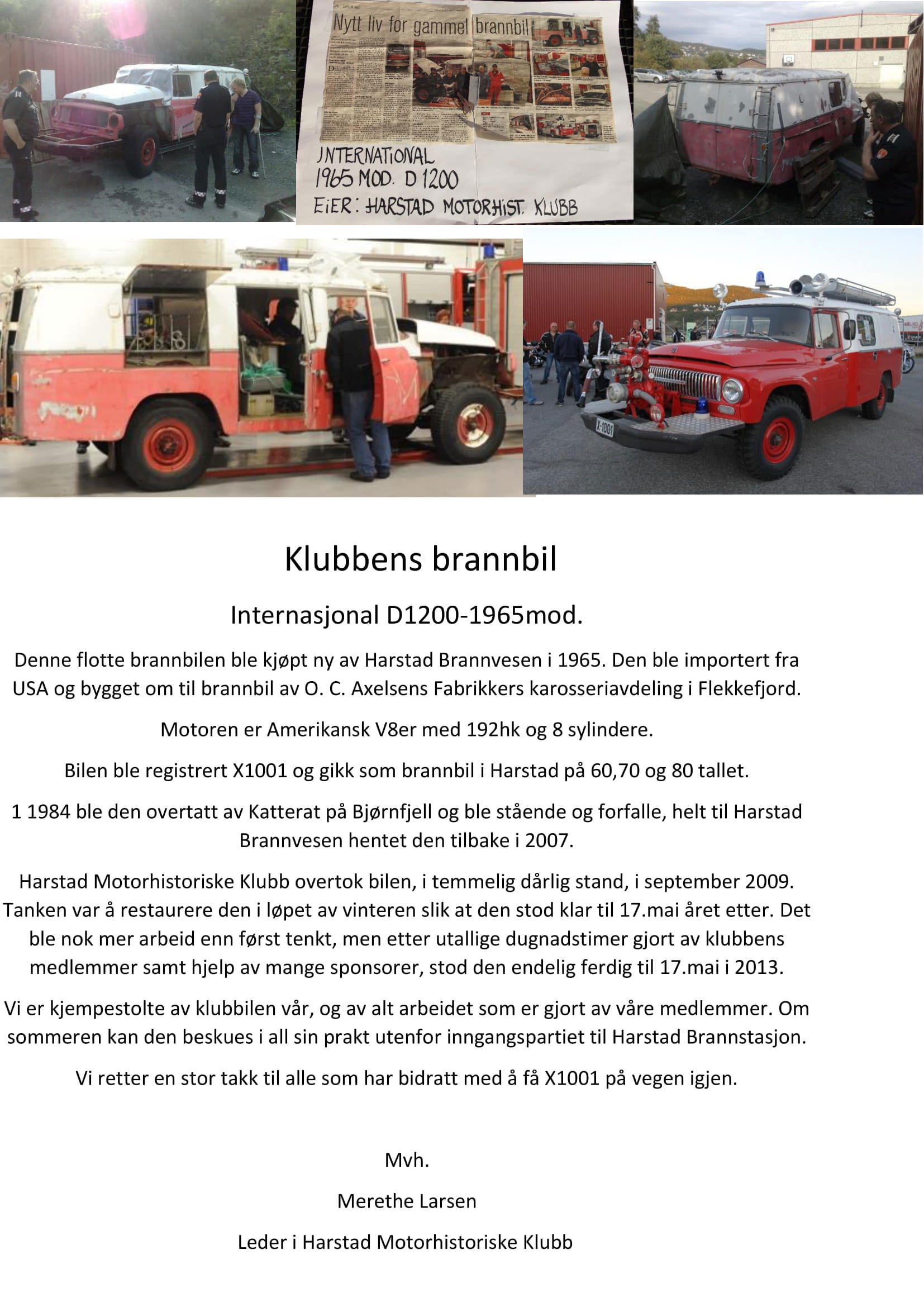 Klubbens brannbil er en Internasjonal D-1200 fra 1965, som har gått som brannbil i Harstad på 60,70 og 80 tallet. Klubben overtok den i temmelig dårlig forfatning i 2009. Etter utallige timers frivillig arbeid utført av våre medlemmer, og med hjelp av mange sponsorer, stod den ferdig til 17.Mai 2013. Pryder Harstad Brannstasjon i sommersesongen.